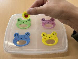 「○○を○色のくまさんが食べる」など口頭での指示を聞いて、
