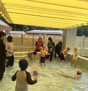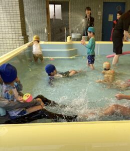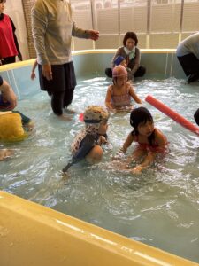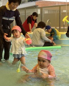 職員の動きを真似して身体を動かしプール前の体操をする姿も見られ、プールでは水鉄砲で遊んだり、バタ足をしてみたりと