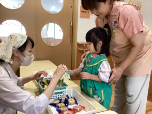 お店屋さんが「ちょうだい」と声をかけると、お財布からお金を出す、お金を支払う、おやつをもらうなどのやりとりを行い、
