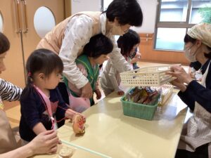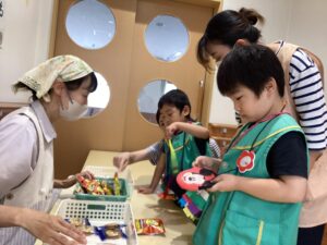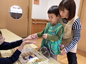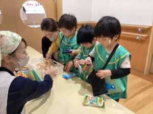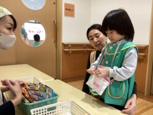 たくさんの種類のお菓子の中からどれにしようか悩む姿が見られましたが、自分でお菓子を選ぶことができました。