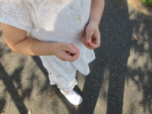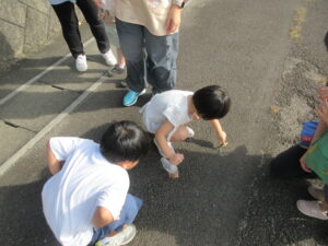 道ばたでどんぐりや小さな落ち葉を見つけて「これ見て!」「かわいいね!」と嬉しそうな声をあげるお子さんたち。