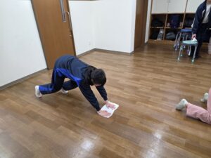 まずは床の拭き掃除!身体全体を使って床を磨きます。
