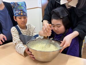 材料を入れたら生地をまぜまぜ!混ぜる係とボウルを支える係に分かれてお友達と協力します✨