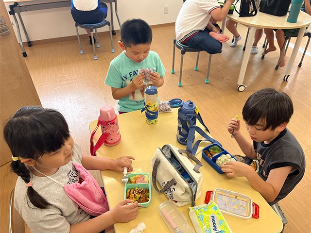 いっぱい動いてお腹すいた~。みんなで楽しくおやつを食べます。