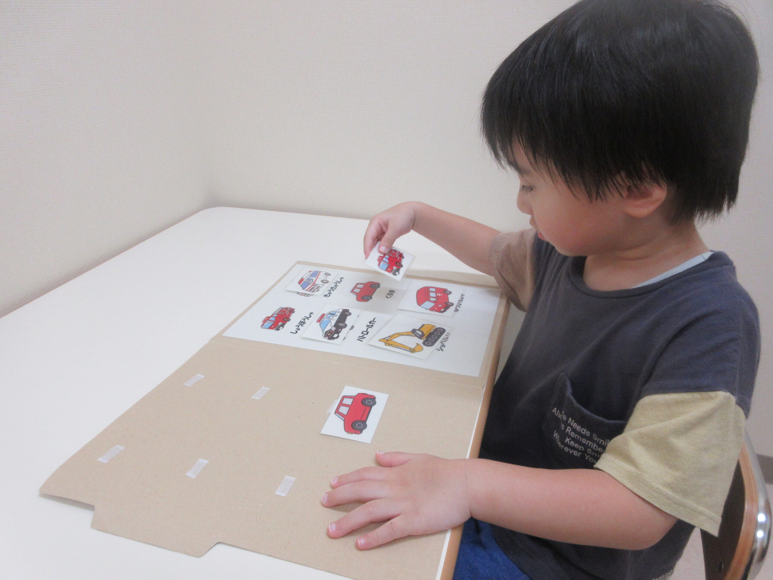 “おはようの歌”を歌って、元気に朝のあいさつ。絵本や手遊びなどを行ってから、写真やイラストで今日の予定を確認します。