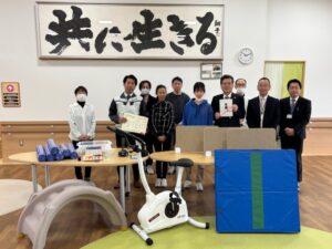 12月23日(火)に、フタバ産業労働組合様から社会貢献活動の一環として、各施設へエアロバイクやヨガマット、ままごとお寿司セットなどをご寄附いただきました。