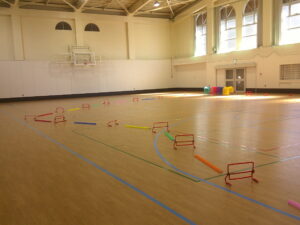 まずはハードルと平均台を交互に行います。