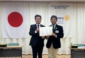 10月30日(木)に、岡崎市内で活動されている岡崎東ロータリークラブ様からお子さんの健やかな成長に役立てて欲しいと、当法人こども発達支援センターにお子さんが日頃遊ぶことができる遊具二つ「スペースブロック(さんかくん)」「プレイベース」の寄付をいただきました。